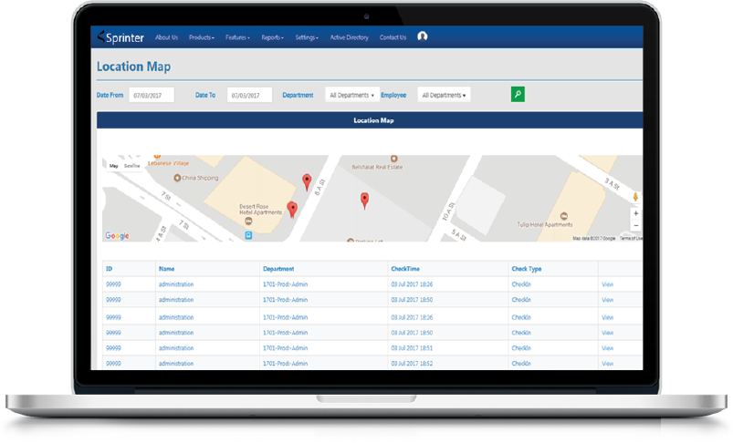 Sprinter Time and Attendance Mobile App compliments Sprinter Web Based Software and can be configured to track the location of each user. Sprinter Web Based Software allows your supervisors and administrators to track the location of the employee on their desktop or an internet connected device.