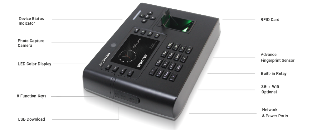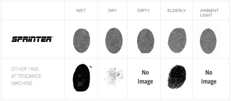 For conventional fingerprint technologies to function, users with clean fingerprints are needed. Herein lie the challenges to conventional readers, which don’t take into account the real world wear and tear of the fingerprints, resulting in high failure verification rates. With it’s patented fingerprint technology and coupled with the world’s most advance algorithm, the Sprinter A700 was designed to perform in today’s real world environments functioning even when users have wet, dry, aged,cut or damaged fingerprints. Using the industry’s best liveness detection technology, we provide the most secure and accurate fingerprint terminal available.