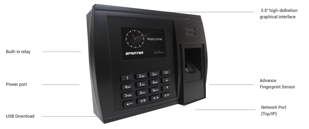 Scheduled bell, Workcode, Webserver, SMS, Auto status, DST, Log query, User role management, Fingerprint expired date seting, Shortcut key seting, Fingerprint image display, Main-screen picture change, External bell